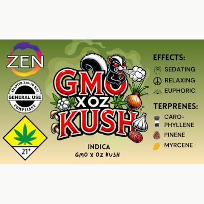 Zen GMO Genetics & Strain info: GMO X OZ KushBaby Buds: Premium Indoor Flower Small Batch Craft Cannabis Always Hand Trimmed with Care. Same great flower just smaller budsClean Weed Practices: Zen prioritizes purity and quality, focusing on pesticide free methods and growing indoors to maintain the integrity of their cannabis strains.