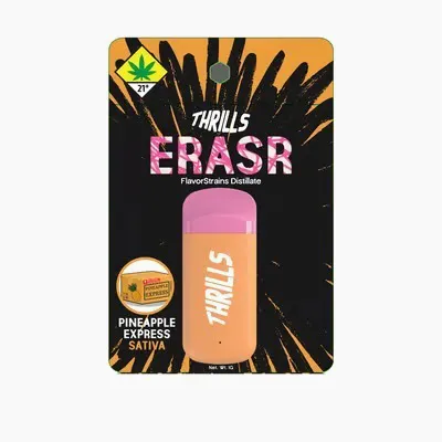 The Thrills ERASR is a line of high-potency cannabis distillate disposable vapes, often sold as 1g or 2g all-in-one (AIO) devices. They are designed for convenience, coming pre-charged and ready to use, featuring a distinct, often pink, mouthpiece designed to mimic "eraser-tops".