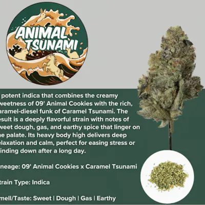 Animal Tsunami is a potent indica that combines the creamy sweetness of 09' Animal Cookies with the rich, caramel-diesel funk of Caramel Tsunami. The result is a deeply flavorful strain with notes of sweet dough, gas, and earthy spice that linger on the palate. Its heavy body high delivers deep relaxation and calm, perfect for easing stress or winding down after a long day. Lineage: 09' Animal Cookies x Caramel Tsunami Strain Type: Indica Smell/Taste: Sweet | Dough | Gas | Earthy