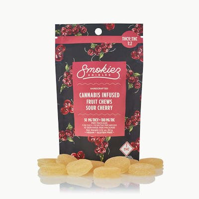 Smokiez™ Sour Cherry THCV:THC:CBD 1:2 Fruit Chews are NOT YOUR AVERAGE FRUIT CHEWS™ ;) -- These delicious fruit chews are a tasty and satisfying way for you to medicate! They are also Vegan, Gluten Free, Dairy-Free, and contain NO High Fructose Corn Syrup. -- Each of our mouth watering fruit chews contain 5 mg of THCV, and 10 mg of THC Made with our high clarity cannabis distillate for great taste! There are 10 pieces per package with a total of 50mg active THCV, 100mg of THC