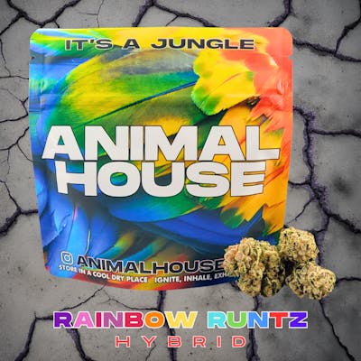 "Rainbow Runtz is a perfectly balanced strain created by crossing Skittlez X DoSiDos. Named for its delicious flavor and gorgeous appearance, Rainbow Runtz is the perfect bud for any lover of classic hybrids. This bud has beautiful heart-shaped dark olive green nugs with deep purple undertones. The flavor of Rainbow Runtz is a candy front with a pungent fuel back. Animal House ""Sunlight Assisted Indoor Flower"" is grown in the Hudson Valley on a solar powered independent farm by legacy growers with decades of experience growing under lights. We hand-trim and hand-select every bud that goes into each package to ensure customer satisfaction."