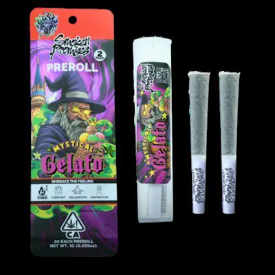 Introducing Mystical Gelato - a spellbinding indica-heavy hybrid that will cast relaxation and creativity on your mind and body. This enchanted strain boasts dark purple buds and a rich, velvety smooth flavor profile, wearing a tapestry of creamy notes and a hint of mystical spice. As you indulge in its magical effects, your senses will be transported to a realm of serene wonder, where stress and worry vanish like magic. Let Mystical Gelato be your wizard's brew, conjuring a sense of calm and inspiration that will leave you under its spell forever.Pack of two, 100% premium flower pre-rolls.Buds too small for our eighths are immediately ground and freshly rolled.Smoken Promises custom-branded filter..5G each pre-roll, total 1G (0.035oz).