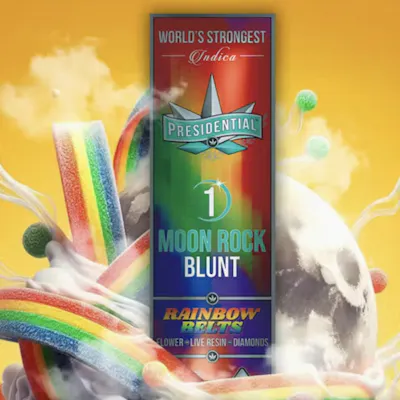 Presidential Moon Rock Infused Blunt Indica Rainbow Belts 1.5g delivers an ultra potent smoking experience combining premium flower coated in concentrates and rolled into a slow burning blunt. Expect a vibrant flavor profile with sweet fruity candy like notes layered with subtle citrus and earthy undertones for a smooth and flavorful draw. This indica infused blunt provides deeply relaxing and euphoric effects that settle into a calming body high making it ideal for evening use unwinding or full body relaxation.