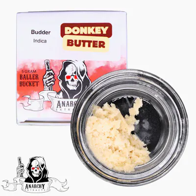 Anarchy Extracts Baller Bucket Budder – Donkey Butter (5g) delivers a rich and potent concentrate with a smooth, buttery texture that’s easy to handle and ideal for dabbing. Known for its bold and savory profile, this strain features notes of earthy pine, diesel, and subtle creamy nuttiness, creating a deep and complex inhale. Commonly associated with terpenes like Caryophyllene, Myrcene, and Limonene, Donkey Butter provides a relaxing and euphoric high that settles heavily into the body, making it an excellent choice for evening use, stress relief, and full-body relaxation.