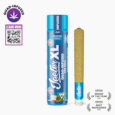 Quad Infused Jeeter XL Indica Blue Zkittlez 2g is a powerhouse pre-roll packed with 2 grams of high-potency flower infused with concentrates and kief for a deeply relaxing experience. Blue Zkittlez, an indica-dominant strain, features a terpene profile likely rich in Myrcene, Limonene, and Caryophyllene, delivering sweet berry candy flavors with earthy undertones. This XL joint offers a heavy, full-body high and soothing mental calm, making it ideal for evening use—perfect for stress relief, deep relaxation, or winding down with rich, flavorful smoke.