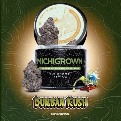 Michigrown Prepacked Flower Indica Durban Kush 3.5g offers a rich, calming cannabis experience crafted for those who appreciate deep relaxation without sacrificing flavor. This indica-leaning strain features dense, well-cured buds with earthy, pine-forward aromas layered with subtle sweet and spicy undertones. Known for its smooth smoke and potent effects, Durban Kush delivers a soothing body high that can help ease stress, tension, and evening restlessness, making it an ideal choice for winding down after a long day. Carefully prepacked by Michigrown to preserve freshness and terpene integrity, this eighth is perfect for both seasoned users and anyone seeking a dependable, tranquil indica experience.