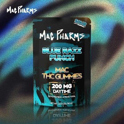 Mac Pharms Gummies Sour Blue Razz 200mg are tart, berry-forward hybrid edibles that pack a flavorful punch and balanced effects. Infused with 200mg of THC, these gummies offer a bold sour blue raspberry flavor followed by a smooth, uplifting high. Expect a euphoric mental buzz with mild body relaxation—ideal for anytime use. Perfect for enhancing mood, sparking creativity, or enjoying a flavorful edible with a tangy twist.