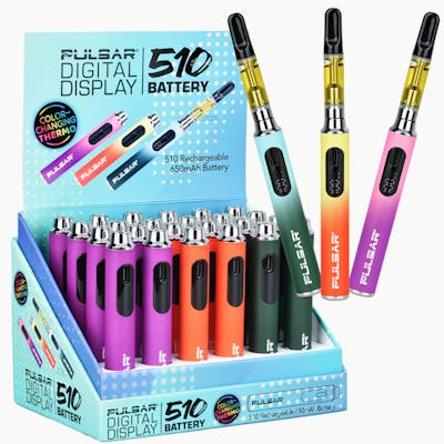Enjoy the benefits of a smart battery of many colors with the Thermo Series Digital Display 510 Battery from Pulsar. No matter which thermochromic color-changing color you choose to stock, this cartridge battery has a digital display screen on the side that shows battery life and voltage setting, as well as preheat and charge indicators. With three preset voltage settings to choose from, users can prioritze rich flavors or thick clouds; the preheat function applies a low heat for 15 seconds to liquify crystals and remove clogs. The battery has single button operation and universal 510 threading to work with most vape cartridges.