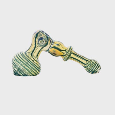 Yellow and green swirl glass design 8" Large hammer-style bubbler Thick, durable glass construction Ribbed accents for better grip Smooth, cool filtration with added water chamber Eye-catching and perfect for daily use Design and Color may vary