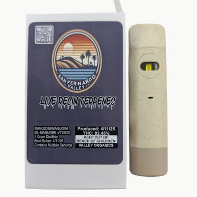 SFV is a sativa-dominant distillate cart infused with live resin terpenes for enhanced flavor and vibrant effects. Each draw delivers smooth, consistent vapor with bright citrus and herbal notes layered over subtle earthy undertones, true to the classic SFV profile. With 82.45% THC, this cart provides a fast-onset, with an uplifting experience that boosts focus, creativity, and energy—ideal for daytime use or whenever you need a clear-headed lift. Reliable, flavorful, and effortless, it’s a premium choice for sativa enthusiasts. We enhance our vape carts by blending high-purity distillate with cannabis-derived live resin terpenes. These terpenes are extracted from fresh-frozen flower, preserving the strain’s natural aroma, flavor, and character. By adding them back into the oil, we restore key plant compounds that distillation removes, giving the cart a richer flavor and a smoother, more authentic draw. While not full-spectrum in the strict sense, the addition of live resin terpenes creates a noticeably more full-spectrum experience with improved complexity, balance, and true-to-strain effects.