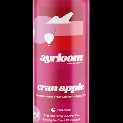 “up” Cran Apple cannabis infused beverages 2:1 THC:CBD 10mg THC 5mg CBD. Cran-apple is Ayrloom's newest beverage flavor! Whether your holiday shopping, decorating, or just chillin’ at home, this infused cran-apple cider is ready to adjust some altitudes BEST SERVED COLD. USE WITHIN 48 HOURS OF OPENING. SERVING SIZE: 1 CAN