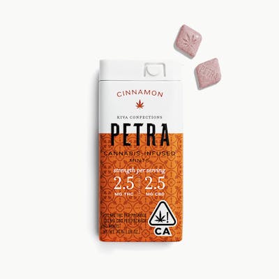 Sweet and spicy with just a touch of heat Cinnamon Petra freshens your breath and warms your senses. At 2.5mg THC + 2.5mg CBD per serving Petra is perfect for the new or casual cannabis user and the seasoned cannabis user looking for a consistent low balanced dose of THC & CBD throughout the day. Ingredients: Xylitol Saigon Cinnamon Dextrin Natural Flavors Rebiana (Stevia) Fruit & Vegetable Juice for Color Cannabis Extract Magnesium Stearate Silicon Dioxide