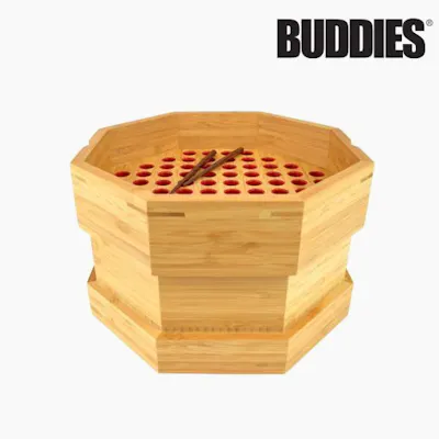 Authentic | This amazing rolling bump box i made by wood device specialists Buddies! Functional | Maximize time and cone packing efficiency with this bump box packing 76 cones at once. Durable | Due to the build makeup of this artisan bump box you can expect a lengthy lifespan. Simple | Simply load your 98s cone into the designated slots and pack your content Full Box Contents | Buddies Bump Box with 4 Wooden Pokers, 1 Buddies Scoop Card, and 1 ESD Scoop Card