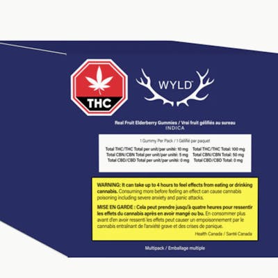 Wyld Elderberry indica-dominant THC:CBN gummies are a 2:1 product featuring a balanced dose of CBN. Made using real fruit, botanical terpenes and natural flavours. Each gummy contains 10mg THC and 5mg CBN for a total of 100mg THC and 50mg CBN per pack All Wyld gummies are packaged in compostable pouches and provide consistent experiences. Each Wyld Elderberry Indica Enhanced gummy contains 10mg THC and 5mg CBN combined with the terpenes myrcene, linalool, beta-caryophyllene, and terpineol.