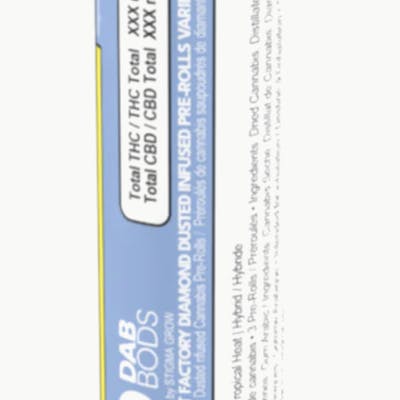 Frost Factory Diamond Dusted Infused Pre-Rolls from Dab Bods is a premium 3 x 0.6g pack that features expertly crafted pre-rolls infused with high-potency distillate and enhanced with botanical terpenes and then finished with a dazzling coat of THCA diamonds for that next-level sparkle. Just because these pre-rolls are frosty doesn’t mean the strains are—each pack contains two Strawberry Cough and one Tropical Heat. This limited-edition pack delivers rich flavour and a smooth smoke. Strain lineage: Strawberry Cough—Haze × Strawberry Fields. Tropical Heat—OG Kush Breath × Purple Punch.