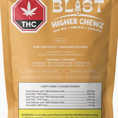 Blast Higher Chewz have a mouthwatering classic flavour that meets a unique chewy texture, engineered for 10x longer chew time and enhanced mouthfeel—supporting faster onset and improved sublingual absorption. Bright, zesty, and citrus-forward, this ruby grapefruit chew delivers a punch of tart fruit flavour with a clean, uplifting finish. Infused with solventless, full-spectrum live rosin sourced from BC and powered by a CBG:THC 5:1 ratio, it’s a terp-rich treat. Each pouch includes five soft chews.