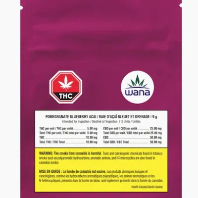 Wana Pomegranate Blueberry Acai 5:1 Gummies combine hints of acidity and a juicy fruit blend. Created with vegan and gluten-free ingredients, each gummy is infused with 25mg of CBD and 5mg of THC terpene-enhanced distillate to create a 5:1 CBD/THC ratio. INGREDIENTS: Sugar, corn syrup, pectin, citric acid, natural flavour, artificial colour, sodium citrate, cannabis distillate.
