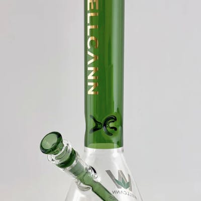 Refined, powerful, and made to impress — this 14-inch beaker bong is a premium piece crafted for durability and style. Constructed from 7mm thick borosilicate glass with an extra-thick beaker base, it delivers unmatched sturdiness and a satisfying weight in hand. The design features a striking green straight neck finished with a clean pink-rimmed mouthpiece, and highlighted by a vertical WELLCANN logo in bold gold lettering — a sleek and modern look that commands attention. The clear beaker base reveals a geometric gold pattern on the bottom and a discreet green WELL CANN leaf emblem, adding subtle artistic detail. This bong includes a 14mm green chunky snapper bowl for deep packs, and a diffused downstem to cool and smooth each hit effortlessly.