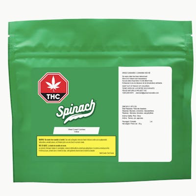 For the first time, the remake is going to be better than the original. Spinach® West Coast Cookies is a new take on a classic strain making for a super flavourful and potent cultivar. A cross between GMO #12 and SFV OG, it has earthy, piney, and citrusy flavours with aromas pumped up from terpenes like myrcene, limonene, and caryophyllene. This powerhouse cross is a flavourful strain, with pumped up potency.