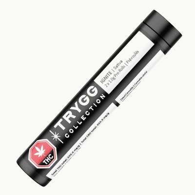IGNITE by TRYGG is a two-pack of 1g, sativa-dominant pre-rolls is made with BC-grown flower and rolled for an even, satisfying burn.