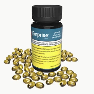 Emprise’s 6,000mg CBD Softgels (60 x 100mg CBD) contains 60 softgels. Each softgel has 100mg CBD. The product is formulated with CBD Isolate (0 - <1mg/sg THC) Cannabis Extract and hemp seed carrier oil. Specifically formulated for THC sensitive consumers looking for high CBD. Each bottle contains 60 softgels (Total 6,000 mg CBD). Softgels offer customers a discrete format and keep cannabis oil fresh and sealed from oxidative degradation.