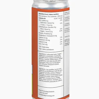 Pacific Island Punch offers a zesty, South Pacific citrus taste that packs a mouth-watering punch of sweet lime and sour orange – balanced and blended with peach and passionfruit notes. Crafted with real juice and nano-infused for fast onset with a 2:1 blend of 10mg THC and 5mg CBD. A vibrant, zesty, sunshine-laden fruit basket for your tastebuds! INGREDIENTS Carbonated Water, Sugars (apple juice concentrate), Coconut oil, Cannabis extract, Acacia gum, Allura red, Ascorbic acid, Caramel, Citric acid, Mixed tocopherols, Quillaia extract, Sodium benzoate, Sunset Yellow FCF, Potassium sorbate, Natural and Artificial flavours