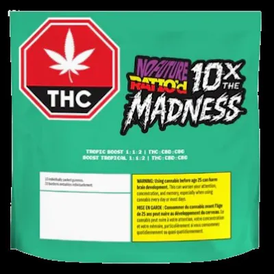 Call it Tropic, call it Boost — either way, this one’s all fruit. 10 gummies with a sugar-dusted tropical flavour profile, each loaded with 10mg THC, 10mg CBD, and 20mg CBG. That’s 100mg THC, 100mg CBD, and200 mg CBG across the pack in a clean 1:1:2 ratio. No Future 10X the Madness: flavour in the front, numbers in the back.