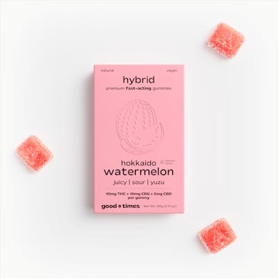 hokkaido watermelon 2:2:1 THC/CBG/CBD - fast acting gummies good times’ hokkaido watermelon gummies bring together the crisp sweetness of watermelon and the tart lift of yuzu—a flavor pairing inspired by japan’s northern coast. with a balanced 2:2:1 blend of thc, cbg, and cbd, these vegan fast-acting gummies are designed for clarity and focus, helping you move through your day with ease and intention—no long wait required. flavor juicy | sour | yuzu effect refreshing clarity, without the wait perfect for staying grounded & present ideal for smooth, balanced daytime moments