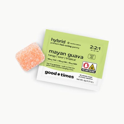 mayan guava 2:2:1 THC/CBC/CBD - fast acting gummies good times’ mayan guava 2:2:1 gummies capture the bold, tropical tang of guava—a fruit long celebrated across central america—brightened with a refreshing sour edge. powered by true delta-9 and our fast-acting technology, these vegan, gluten-free gummies deliver a smooth and balanced experience. crafted with a blend of thc, cbc, and cbd, they’re designed for daytime balance—perfect for staying centered, sparking focus, or enjoying a calm lift without the long wait. flavor tangy | sour | tropical effect steady balance, faster-acting perfect for calm focus & flow ideal for centered, daytime ease