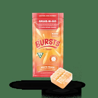 Our gummies are the best in the game! We have perfected the potency, flavor, ingredients, process and activation time. Bursts by Sauce are powered by our 2X Nano Live Resin, which is created using a proprietary process of both encapsulation and sonic energy to break down the molecule size. This makes the gummy hit faster, harder and smoother than any other gummy. Our gummies are also organic, and vegan and gluten free! *Tailor your dosage according to your personal preferences or embark on an intensely elevated adventure by eating the entire gummy. WHITE PEACH: Experience the delicate and captivating flavor of our White Peach High Potency edibles. Inspired by the lusciousness of perfectly ripe white peaches, this treat delivers a taste that is both subtle and enchanting. Indulge in the pure essence of white peaches and let their natural sweetness transport you to a serene orchard, creating a moment of bliss with every bite. Enjoy consistent calming relief within minutes, with the fastest activation on the market using our 2X Nano Indica Live Resin.