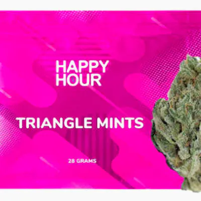 Happy Hour Triangle Mints is a micro-grown, sativa-dominant cultivar crafted from the renowned Triangle Kush x Animal Mints lineage by Seed Junky Genetics. Hand-trimmed, hang-dried, and slow-cured, this 28g offering showcases dense, frost-covered buds with long minty-green formations wrapped in twisty light-amber hairs. Triangle Mints is defined by its complex, layered aroma—a blend of herbal spice, earthy depth, and diesel undertones. When each nug is broken apart, it releases sharp mint and sweet herbal notes that fill the air. Its smooth flavour profile and vivid terpene character make this sativa a standout choice for those who appreciate bold, expressive flower in a generous ounce format.