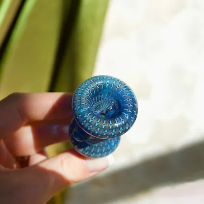 Located in case 22 in the lobby Your shopping cart called, it needs this slide STAT! This slide is so trippy!! The more you look, the cooler it gets. Hold it up to the light and it shines a gorgeous deep blue color! The unique shape allows for a better grip during your sesh. Male, 14mm, and fits most of the bongs that we sell. Measures 2" tall. Each slide is handmade and hand blown, small defects may be present but that's what makes them so charming.