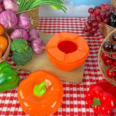 Located in case 1 in the checkout area Cutest pepper in the garden! We love a kitschy oversized object and this bell pepper shaped ash tray is as cute as it is functional! The top of the pepper is a lid so you can hide your ashes when you're done using it!! Whether you smoke or you just want an adorable piece to decorate your home, this ash tray will do the trick. Do not put hot ashes in this tray. Measures roughly 4.5" x 4.5" Made of melamine. Comes as a tray with a removable lid