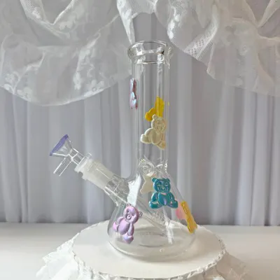 Located in case 10 in the lobby The bear-y cutest bong is here! Yes you saw it right, there are real 3D puffy bears on this bong! Just like your old sticker book except cooler because it's a bong!! Compact AND cute, this bong is sure to be an instant go-to! Fill her with water and she's ready to go! Features: a 14mm slide that is compatible with the slides on our site \<3 a removable 3" downstem with inline perc an ice catcher classic beaker shape 3D iridescent bear pattern all over made of borosilicate glass measures 8" *In order to preserve the bears on this piece, do not use harsh cleaning solutions or alcohol on the outside of this product*