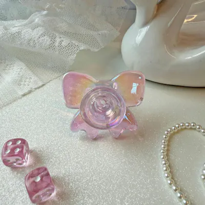 Located in case 22 in he lobby This slide is bow-utiful! This slide is shaped like a cute bow with the prettiest pink iridescent finish - how adorable!! Male, 14mm, and fits almost all the bongs that we sell. Made of borosilicate glass.