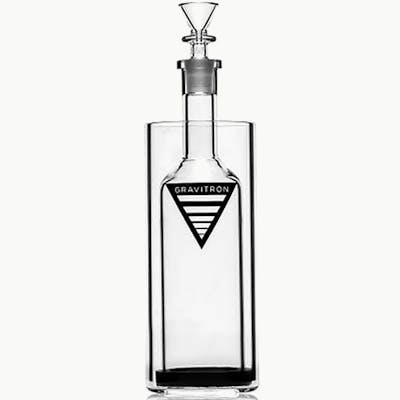 This is the smaller version of the large Gravitron, but it still packs the same kind of punch you'd expect from a gravity smoking system. This new and improved version 2.0 Gravitron boasts a fivefold increase in glass thickness and upgraded platinum cured silicone grommet for a tighter seal. The 14 mm female ground joint now fits any 14 mm male bowl and the flange at the top of the neck makes lifting the bottle a breeze. The Gravitron creates big, efficient hits though gravity and pressure. Start by filling the base halfway with water. Then pack the bowl with dry herb and insert it into the joint at the neck of the bottle. Light the bowl and lift the bottle at the same time. Once the bottle is full of smoke, remove the bowl and place your mouth over the neck, inhaling as you lower the bottle. The Gravitron will give you a dense, pressurized hit with no loss of smoke in the process. Although it's the ultimate party pipe, the Gravitron is still considered one of the most efficient smoking devices on the market today.