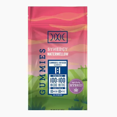 The best of both worlds come together in perfect harmony with vibrant watermelon flavor to help ease what ails you. Each delicious gummy contains 10MG of CBD and 10MG of THC for an entourage effect that leaves you with a very balanced and manageable high. So bite into a watermelon gummy like it’s summertime at the pool and enjoy the CBD:THC SYNERGY.--Our gummies are handmade and fully infused Let the gummy fully dissolve in your mouth for quicker up-take Dixie Edibles are triple lab tested for consistency and quality When you consume a Dixie edible, the THC is processed in your liver—transforming from a Δ-9 is to a more potent 11-hydroxy Edibles can take longer to take effect than other methods of THC uptake, but the effects often last much longer too