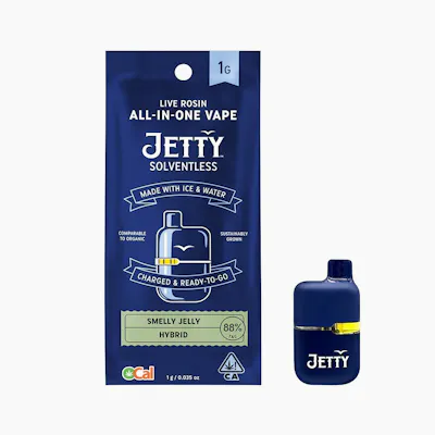 "Smelly Jelly serves up a flavor-packed punch, bursting with fruity funk and creamy undertones. Uplifting yet chill, it’s a great go-to for creative sparks, social vibes, or just kicking back in style.Jetty Solventless is America's #1 live rosin. It is the cleanest oil available, made from OCal certified bud and extracted using only ice and water. Our unique filtration process removes excess fats and waxes increasing purity (and THC %) while keeping all the tasty terpenes. The result: a light, golden oil, and unmatched flavor profile.OCal is the comparable-to-organic program for cannabis grown and manufactured in California. OCal products are cultivated and extracted without pesticides, synthetic fertilizers, or bioengineering. Pure, potent, and portable, Jetty’s All-in-One Vape delivers everything you want in a vape. CCell's industry-leading Mini Tank hardware features EVOMax ceramic heating. Charged and ready to enjoy, it is designed to go wherever you do. "