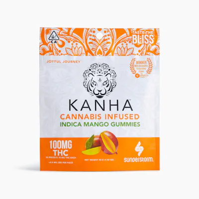 10 pieces x 10mg/gummy = 100mg/bag Kanha gummies are made with all-natural ingredients, coloring, and flavoring. Each gummy is infused with the highest quality cannabis oils to provide the most consistent, safe experience on the market. Our Mango gummies are juicy and sweet, and made with indica terpenes, which induce a calm and relaxed state of mind.