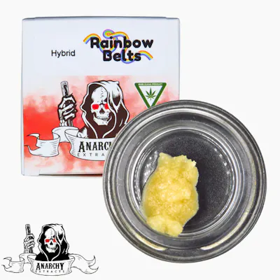 Anarchy, a cannabis concentrate producer known for extracts like shatter, wax, and budder. Rainbow Belts, an evenly balanced hybrid (50% indica/50% sativa) created by crossing Zkittlez and Moonbow. Budder, a whipped concentrate with a creamy, butter-like texture that is easy to handle and high in flavor retention.