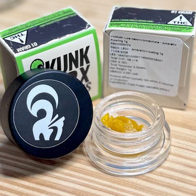 Noble Labs - Skunk Worx Live Resin 1g | Amaretto Frosting THC: 58.11% CBD: 0.16% ... Total Terpenes: 6.55% Terpenes: b-Myrcene 1.852%, b-Caryophyllene 1.456%, Limonene 1.025%, Bisabolene 0.649%, a-Humulene 0.43% ... The cannabis strain Amaretto Frosting appears to be an alternate name for Amaretto Sour or a similar cross, which is generally considered a hybrid strain. However, sources vary on its dominant classification. It is most commonly described as being a slightly indica-dominant hybrid. ... Amaretto Sour is a hybrid strain created by crossing the tasty Zkittlez X (Biscotti X Sherb BX) strains. Named for the iconic adult beverage, this bud packs a punch of amazing flavors and soaring, happy effects that will have you feeling stimulated yet ready to relax in just one tasty little toke. The taste of Amaretto Sour is the perfect treat for any time of day, with a creamy, cherry candy-like flavor with a slightly spicy diesel exhale. Effects: Creative, Euphoria, Happy, Relaxing, Tingly, Uplifting . May Relieve: Anxiety, Chronic Pain, Cramps, Muscle Spasms, Stress . Flavors: Berry, Candy, Cherry, Creamy, Flowery, Fruity, Nutty, Sweet . Aromas: Cherry, Diesel, Earthy, Flowery, Fruity, Nutty, Rose, Sweet