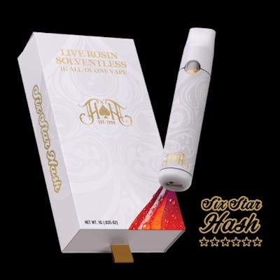 LIVE ROSIN SOLVENTLESS 1G ALL-IN-ONE PURE. SMOOTH. SOLVENTLESS. Heavy Hitters Live Rosin All-In-One delivers the truest expression of the plant. No solvents, no shortcuts. Our 100% Live Rosin is crafted from a single-source family-owned organic farm using sustainable farming practices and living soil. We use only 6 Star Full Melt Hash from the fresh frozen flower, then pack it into a sleek and custom-tuned ready-to-go device. This is a cannabis vape in its purest form. First Freeze – Right off the plant, straight into deep freeze. No drying. No waiting. Just an instant lock on live terpenes and wild, fresh flavor. First Wash – We use only 6 Star Ice Water Hash. One rinse gets you the purest, most intact trichomes. No second rinses, no breakdowns. First Press – One press. That’s it. Tier 1 fresh-pressed live rosin, potent and pure, with rare terp expressions you can’t fake. First Hit – We warm it just enough to flow, then pair it with our no-burn ceramic hardware. Built for low-temp pulls and engineered to protect flavor. No leaks. No burn.