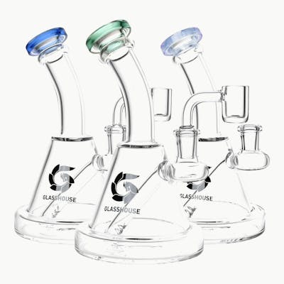 These Bent Neck Glass Dab Rigs from Glass House stand 6.75 inches (17.1cm) and have a fixed downstem and a Glass House logo on the exterior. Made of quality borosilicate glass, this rig includes 14mm male flat top quartz banger. Banger Dimensions: 20mm outer diameter, 14mm inner diameter, 27mm height, 23mm depth, 3mm thickness