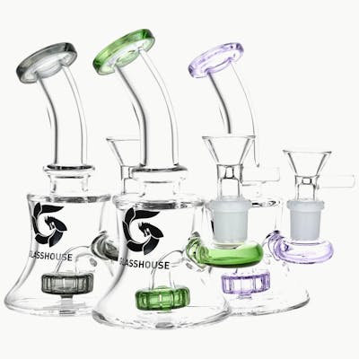 The Circ Perc Glass Water Pipe from Glass House features a bell-shaped pipe body with a circ style percolator. These quality borosilicate glass water pipes have an angled mouthpiece and a Glass House logo on the exterior. Measures 5.5 inches (14cm) tall. Includes 14mm male herb slide with a handle.