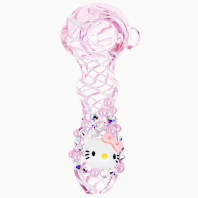 The Greetings Kitty Glass Spoon Pipe is made from transparent pink borosilicate glass with white stripes swirling around the body. The lower stem is decorated with a cartoon cat's face surrounded by metallic jewels and pink pearls. A carb hole is built into the left side of this pipe. Measures 4 inches (10.2cm) long.