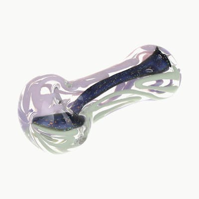 The Icing On The Side Dichro Stripe Glass Spoon Pipe is made from transparent borosilicate glass with a single dichro-flecked stripe down the middle and pastel-colored ribbons on either side. The classic spoon style body has a rounded mouthpiece and bowl with a carb hole on the left side. Measures 3.75 inches (9.5cm) long.