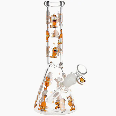 The Stoned Orange Cat Beaker Glass Water Pipe is made with clear borosilicate glass and decorated with decal designs depicting a pattern of the stoned orange cat with a wide smile. The pipe includes a removable slitted diffuser downstem for water filtration and a 14mm male herb slide with a matching tab handle. Measures 10 inches (25.7cm) tall.