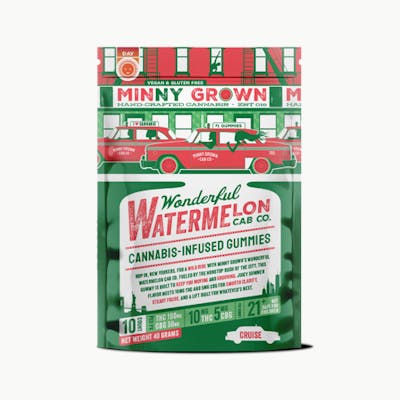 Minny Grown’s Wonderful Watermelon Cab Co. gummies are fueled by a 2:1 blend of 10mg THC and 5mg CBG, delivering a smooth, focused buzz without the fog. Perfect for keeping you moving and grooving with a burst of juicy summer flavor. Hail a ride to a brighter state of mind.