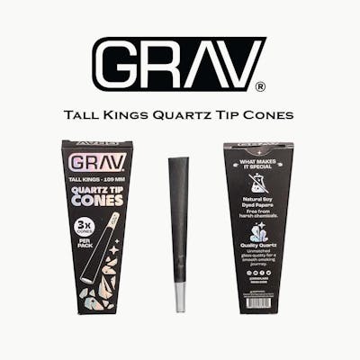 GRAV® Tall Kings Quartz Tip Cones Upgrade your smoking ritual with GRAV Tall Kings Quartz Tip Cones. These 109mm cones are rolled with black soy-dyed all-natural wood pulp paper, come with a quartz glass tip for a smoother hit and easy smoking experience. Each pack contains three cones, ready to elevate your smoking experience. Key Features:109mm cones with quartz glass tips / Black - Black soy-dyed natural wood pulp paper / Three cones per pack