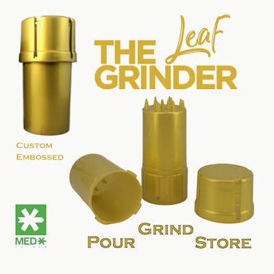 Multi-use, 3-piece, weed container with built-in grinder that's air-tight, water-tight and smell proof, composed of medical grade plastic that's environmentally safe. Pour. Grind. Store. Made in USA for Leaf.